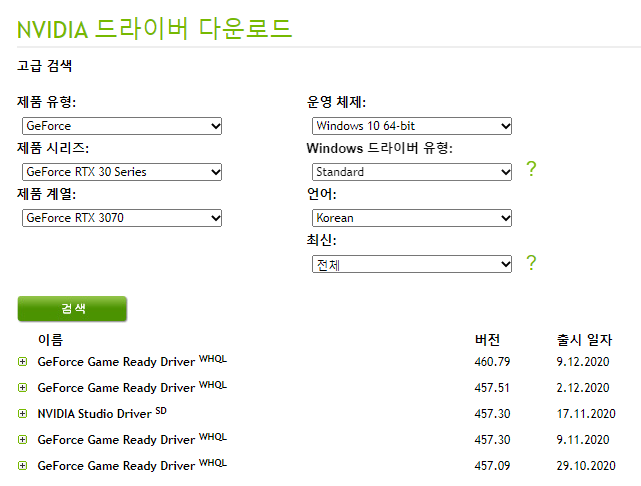 ASUS 홈페이지에 가서 받으려고 보니 드라이버를 제대로 찾을 수가 없어서 Nvidia 홈페이지를 방문해서 3070 드라이버를 다운로드 했습니다.