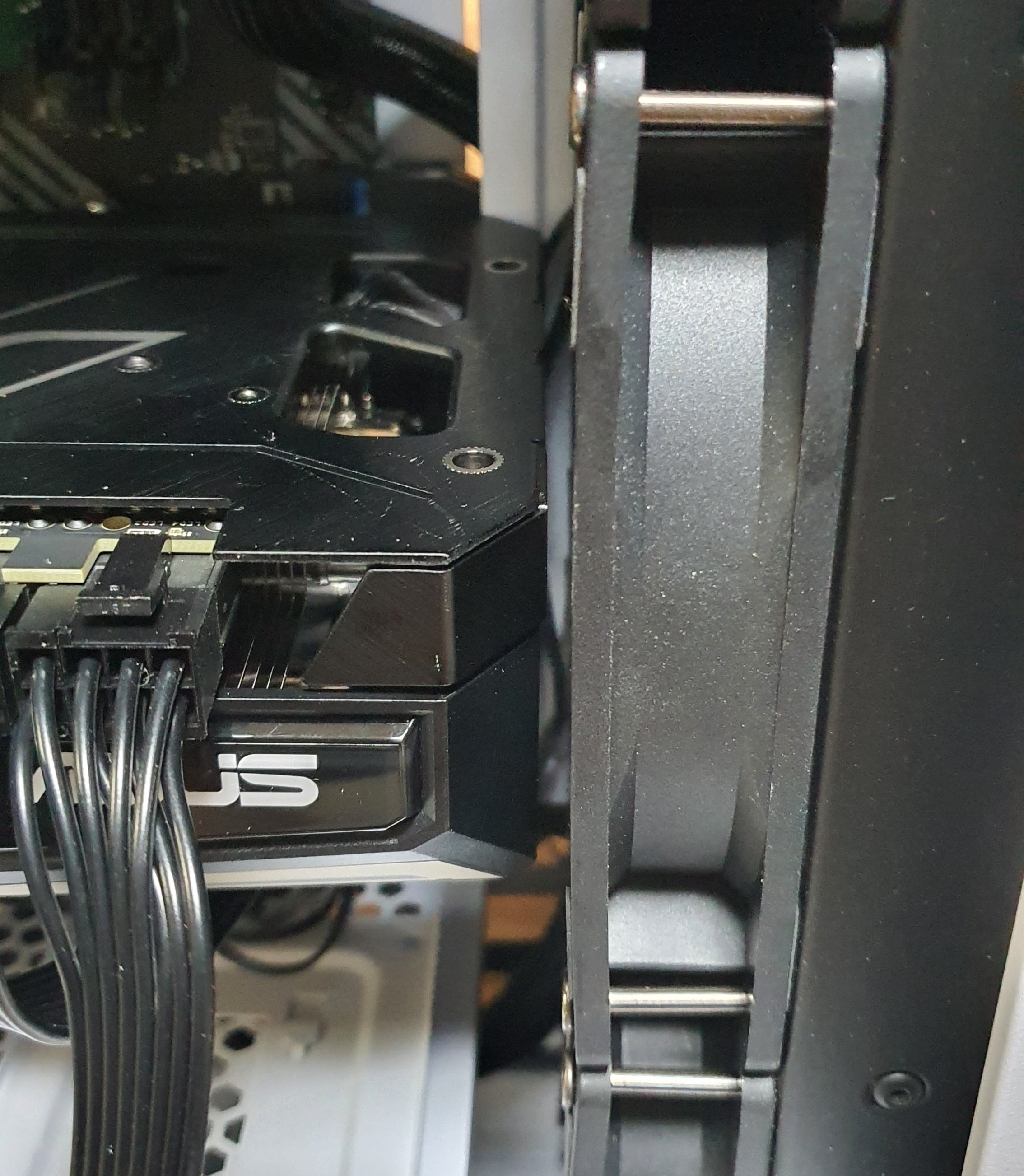 그래픽 카드가 생각보다 컸습니다.. 그래픽카드가 안들어가서 억지로 밀어 끼웠습니다. 원래 이러면 안되는 것을 알지만 샀는데 당장 써보고 싶잖아요? 요래 저래 돌려서 끼우니 들어가긴 했습니다.. 조립하고 보니 틈이 0.5cm도 안되더군요.